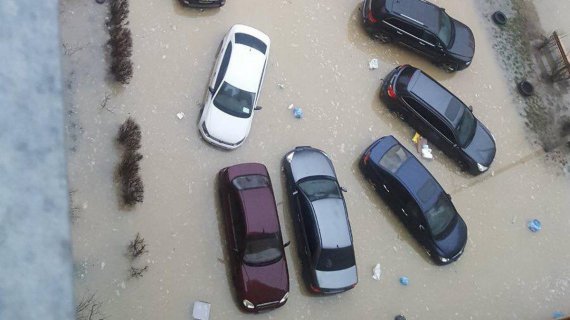 У Солом'янський районі Києва в Турецькому містечку прорвало трубу біля житлового будинку. Вода полилася рікою до сусідньої багатоповерхівки, затопила підвали, подвір'я і машини, які були там припарковані.