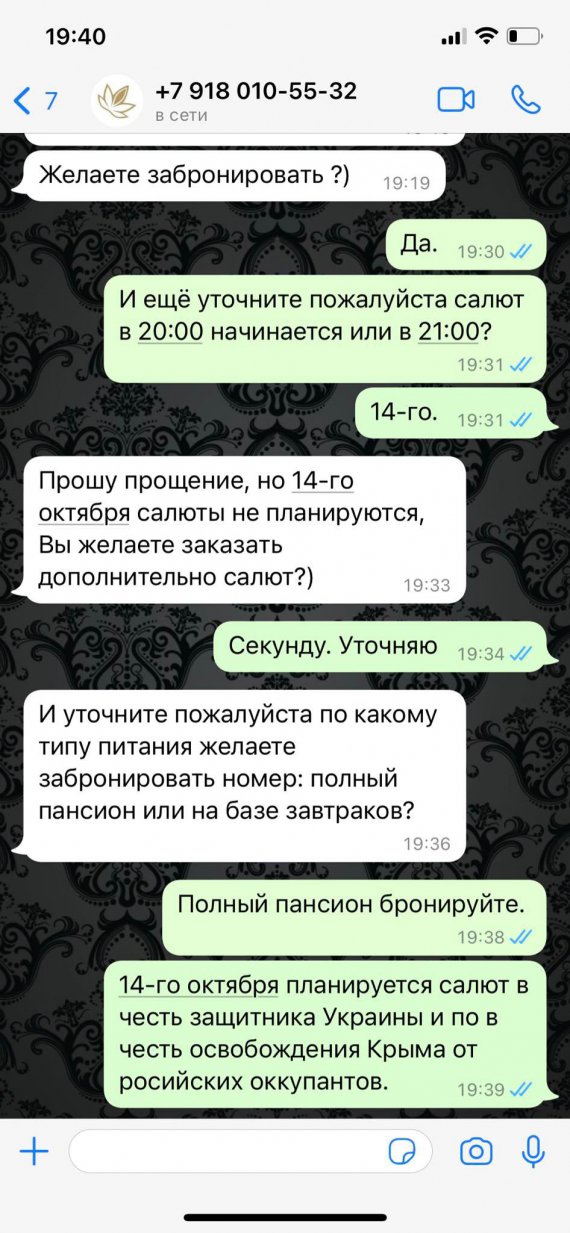Журналістка вказала, що мета візиту – це перегляд салюту на честь дня звільнення Криму від російських окупантів, менеджер із задоволенням прийняв заявку та забронював номер.
