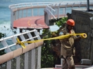 Споруду було закріплено над скелями на узбережжі на висоті десяти метрів. Впало приблизно 50 метрів велодоріжки. Це трапилося після того, як опори, що її підтримають, накрило хвилею.