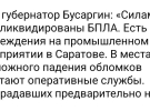 "Силами ППО ліквідовано БПЛА. Є пошкодження на промисловому підприємстві в Саратові. У місцях можливого падіння уламків працюють оперативні служби. Постраждалих заздалегідь немає", - написав Бусаргін.