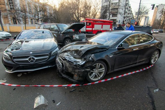 На перехресті бульвару Лесі Українки і вулиці Госпітальної Tesla Model S на швидкості врізався в Range Rover та від удару влетів у Mercedes S-Coupe, повідомляє "Інформатор".