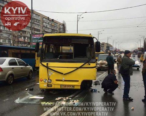 У Києві на вулиці Теодора Драйзера легковик вилетів на зустрічну і врізався у дві маршрутки. Постраждали троє людей. ДТП паралізувала рух транспорту щонайменше на годину.