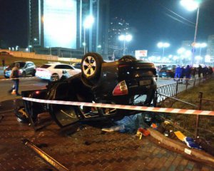 Автомобіль злетів з моста, перекинувся і впав на тротуар колесами догори біля станції метро Лівобережна в Києві.