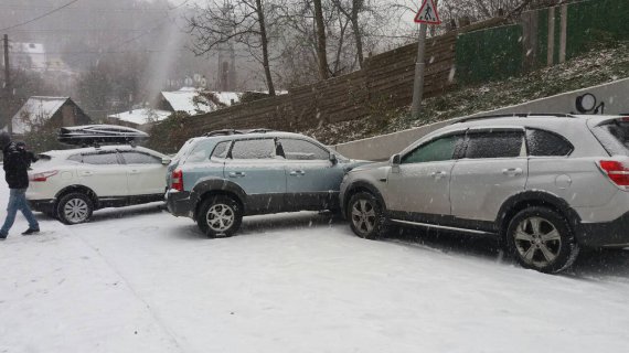 "Ми спускалися з гірки. Водійку за кермом Hyundai почало нести. Вона призупинилася біля бордюра. Інший водій хотів її об'їхати. Його винесло серед дороги. У нього врізався третій автомобіль, ми були четверті. Зробити щось було неможливо. Нас у машині несло і ми просто дивилися, як влітаємо в праве переднє колесо Tucson. Удав був потужний, машину треба забирати евакуатором", - розповіла жінка.