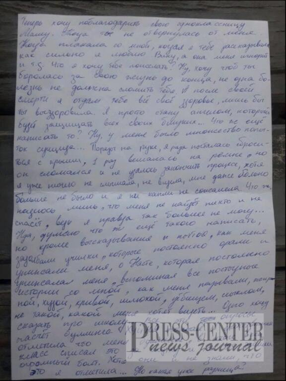 Зі слів школярки, єдиною, хто в класі до неї ставився добре, була однокласниця М*. У передсмертній записці дівчина подякувала їй за це і сказала, що стане для неї янголом, який буде її охороняти з того світу.