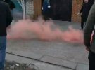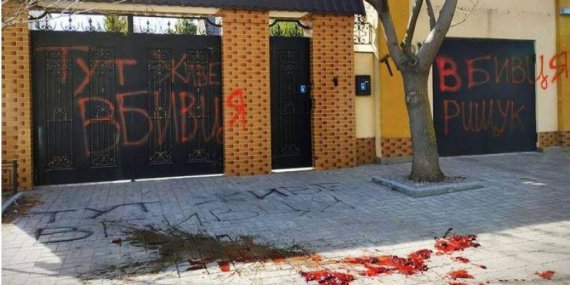 Протестувальники написали на воротах червоною фарбою "Тут живе вбивця", а також підпалили димові шашки. Вчинили так, бо підозрюваний в організації вбивства Катерини Гандзюк Олексій Левін заявив, що заступник голови Херсонської ОДА Євген Рищук просив "покарати" активістку.