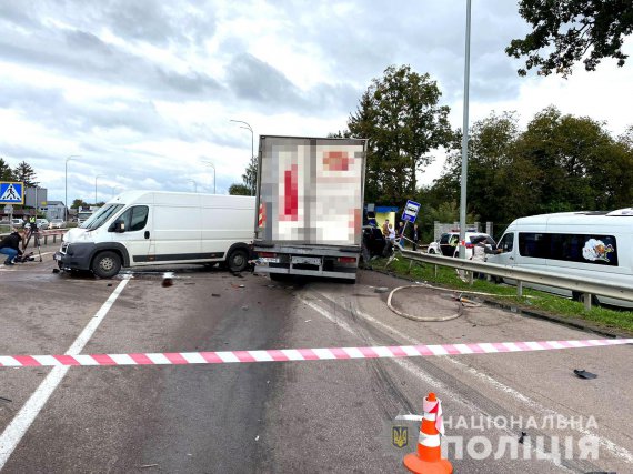"Водій вантажівки зіткнувся із трьома автомобілями, що зупинилися перед регульованим пішохідним переходом на заборонений сигнал світлофора - Citroen Jumper, яким керував 39-річний рівнянин, Toyota RAV4 під керуванням 59-річної жительки Донецької області та BMW Х3. Від удару останнє авто врізалося у світлофорний стовп", - сказано в повідомленні.