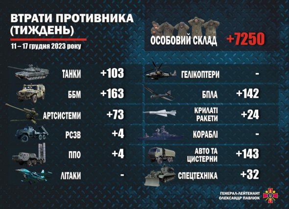 "За тиждень з 11 по 17 грудня Силами оборони України знищено близько 7250 осіб особового складу противника", - написав він.