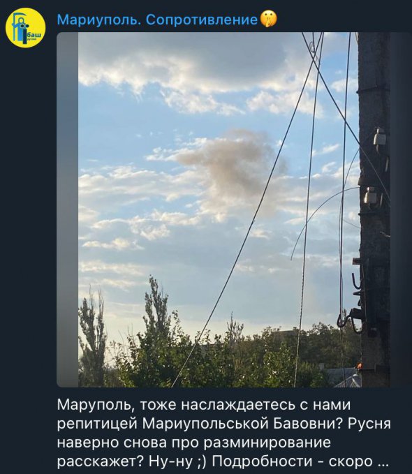 "Маріуполь. Близько 17:50 гучний вибух, який чуло майже все місто. Наш спротив м'яко натякає на підготування до Маріупольської бавовни. А значить сьогодні на нас чекають приємні новини з Маріуполя", – розповів Андрющенко.