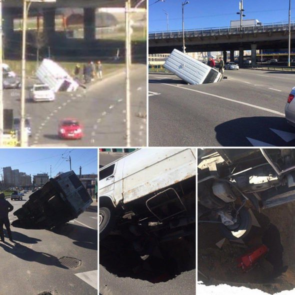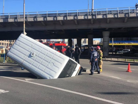 На Деміївській площі в Києві посеред дороги провалився під асфальт мікроавтобус.