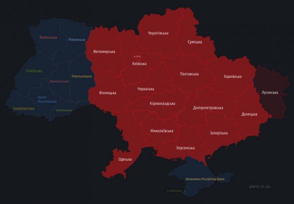Повітряна тривога на цей час оголошена у всіх областях України.