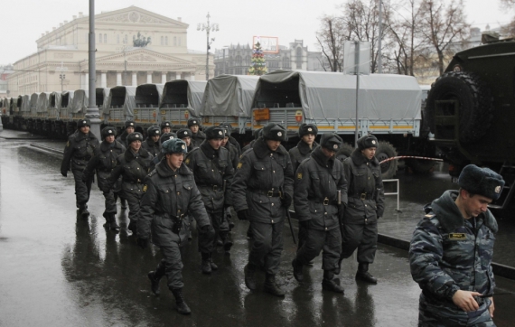 На площі Революції стоять десятки вантажівок з бійцями внутрішніх військ, поруч розгорнута польова кухня. Раніше повідомлялося, що на площі Революції збиралися провести акцію прихильники націоналістичних рухів.