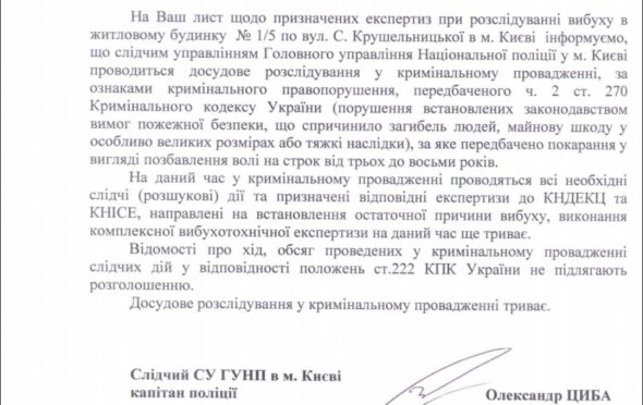 "У кримінальному провадженні проводяться всі необхідні слідчі/розшукові дії. Та призначені відповідні експертизи до КНДЕКЦ та КНІСЕ, направлені на встановлення остаточної причини вибуху. Виконання комплексної вибухотехнічної експертизи триває", - сказано в листі.