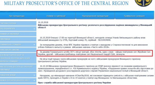 "За даними Генерального штабу ЗСУ з місця трагедії, обоє пілотів, один з яких - офіцер повітряних сил Збройних сил України, другий – військовослужбовець повітряних сил Національної гвардії США, загинули", - повідомили у Військовій прокуратурі Центрального регіону.
