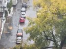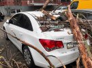 По Києву фіксують зірвані фасади, побиті автомобілі, вирвані дерева. Деякі дороги перекриті через падіння дерев.