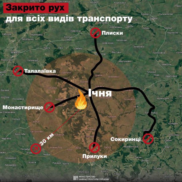 У Ічнянському районі на Чернігівщині дороги закрили для усіх видів транспорту. Це пов'язано із пожежею та вибухами на території 6 арсеналу Міністерства оборони поблизу смт Дружба. Про це повідомив Укравтодор та опублікував відповідну схему.