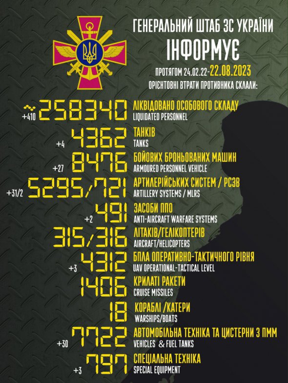 Загальні бойові втрати Росії на ранок 22 серпня становлять уже понад 258 340 окупантів.