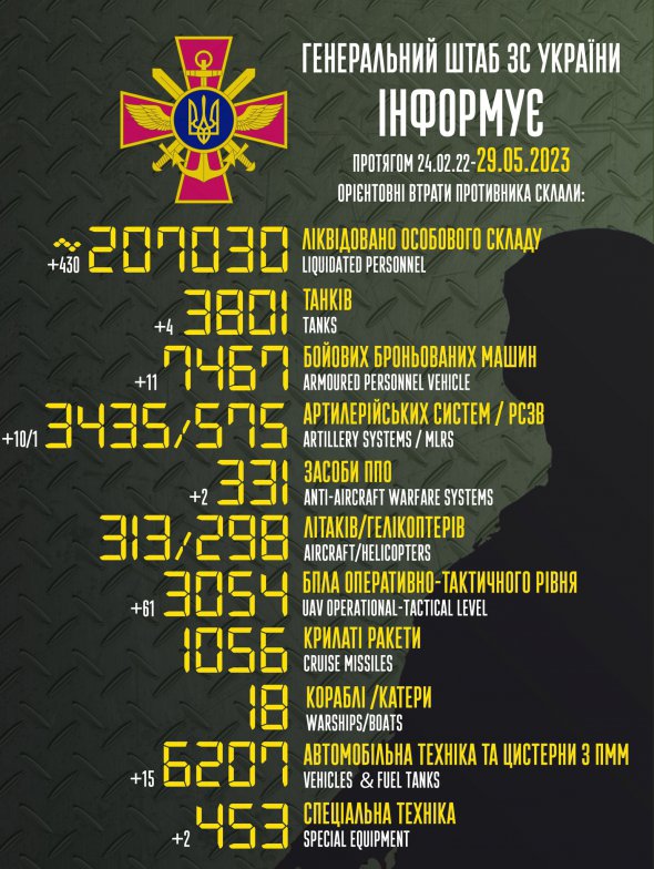 Загальні бойові втрати Росії на ранок понеділка, 29 травня, становлять 207 030 окупантів.