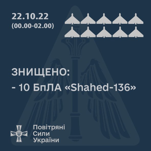 "Силами та засобами протиповітряної оборони повітряного командування "Південь" збито десять безпілотників-камікадзе типу "Shahed-136", ‒ йдеться у повідомленні.