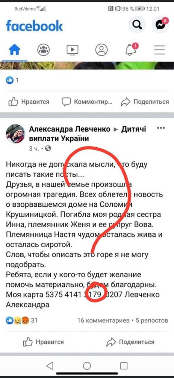 "На жаль, у наш час трапляються випадки, коли на людському горі наживаються інші. Наші психологи працюють на місці вибуху у житловому будинку по вул. Соломії Крушельницької, 1/5, постійно надають психологічну допомогу постраждалим, зокрема і дівчинці Анастасії, яка втратила у цій трагедії свою родину. Так ось, у соціальних мережах, час від часу почали з'являтися пости з номерами карток для збору коштів для допомоги Насті!" - розповіла Світлана Водолага.
