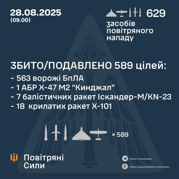 За попередніми даними, станом на 09:00, протиповітряною обороною збито/подавлено 589 повітряних цілей: