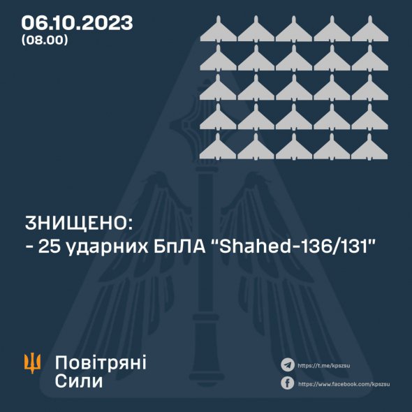 "Силами та засобами Повітряних сил у взаємодії із ППО Сил оборони України, знищено 25 Shahed-131/136, зокрема у межах Одеської, Миколаївської, Харківської, Дніпропетровської, Черкаської та Житомирської областей", – йдеться у повідомленні.