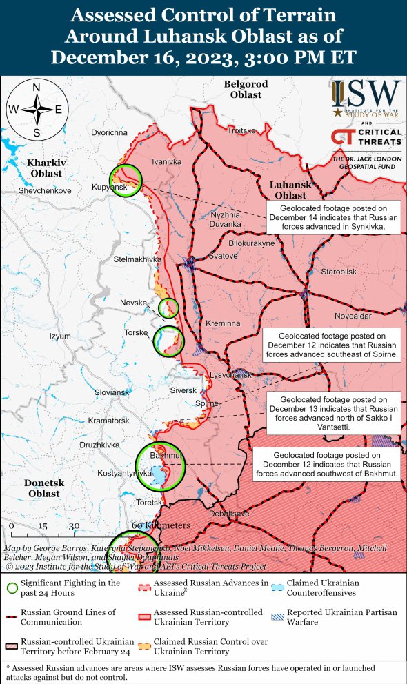 Російські війська 16 грудня вели наступальні дії поблизу Авдіївки. Геолокаційні кадри показують, що війська РФ просунулися до західних околиць промислової зони. Російські "воєнкори" стверджували, що сили РФ нібито просунулися на захід від залізниці на північ від Степового.