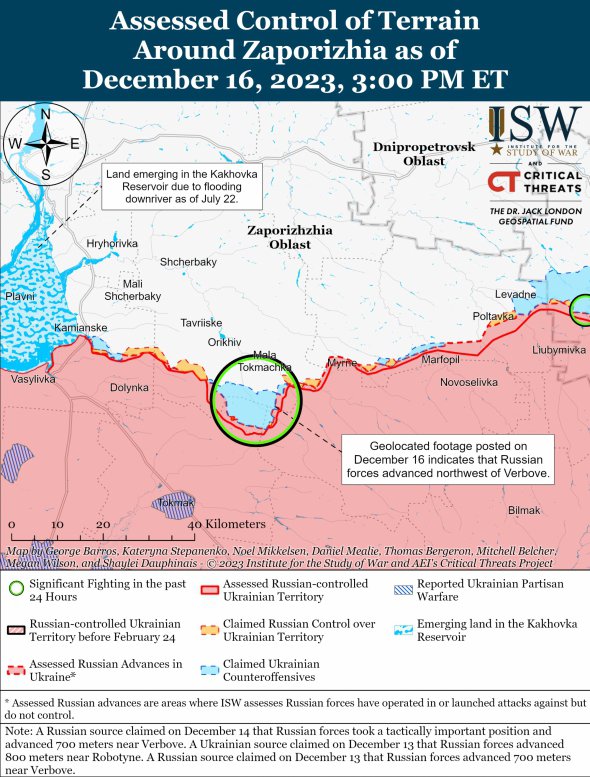 За даними Генштабу ЗСУ, 16 грудня українські війська відбили два російські штурми поблизу Старомайорського на межі Донецької та Запорізької областей. ЗСУ також продовжували контрнаступальні дії в районі Роботиного на заході Запорізької області, але жодного підтвердженого просування не зробили.