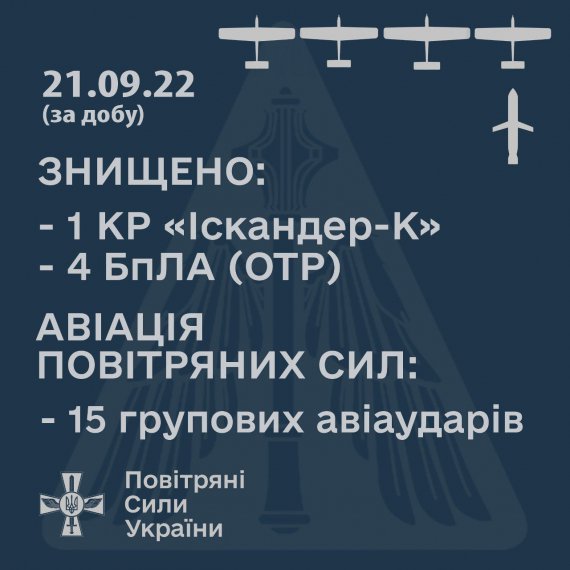 Винищувачі продовжують утилізацію російських систем протиповітряної оборони. Про це вранці 22 вересня повідомили в командуванні Повітряних сил Збройних сил України.
