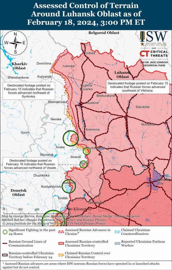 Позиційні бої також тривають на південний захід від Авдіївки, на захід і південний захід від Донецька, в районі Бахмута, Кринок, а також поблизу Кремінної. Про це свідчать нові карти бойових дій, опубліковані Інститутом вивчення війни (ISW).