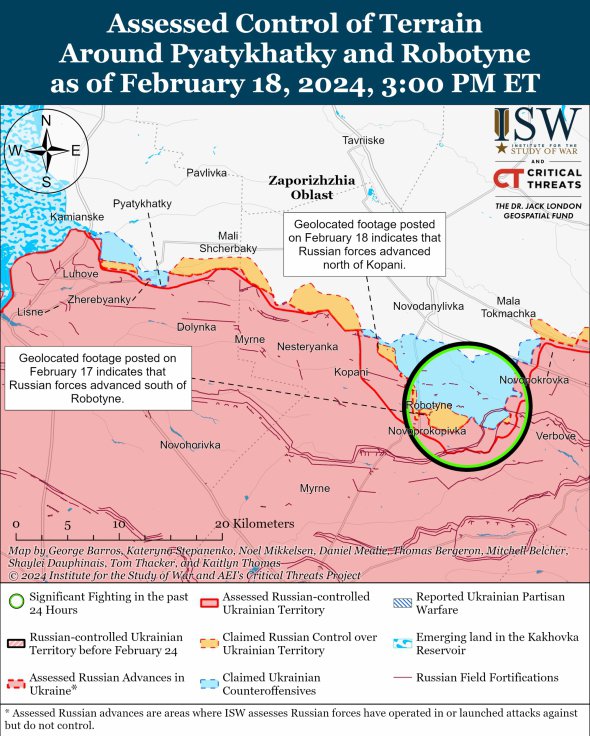 Після повідомлень про відновлення наступальних операцій на цій ділянці фронту війська РФ досягли незначних підтверджених успіхів у західній частині Запорізької області. Геолокаційні кадри, опубліковані 18 лютого, показують, що війська РФ просунулися вздовж смуги на північ від Копані. Російські "воєнкори" також стверджували, що війська РФ просунулися до 1,7 км на північний захід від Вербового і до 2 км поблизу самого Роботиного, хоча експерти ISW не спостерігали візуальних доказів цього.