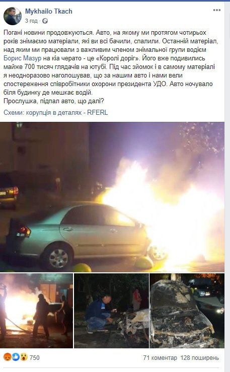 "Погані новини продовжуються. Авто, на якому ми протягом чотирьох років знімаємо матеріали, які ви всі бачили, спалили, - написав Ткач.