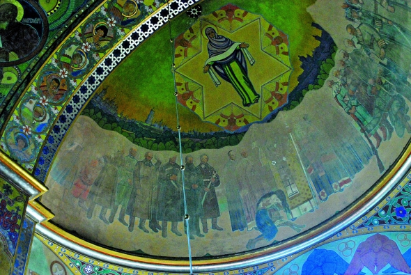 Воїнів Небесної сотні, президента Росії Володимира Путіна і патріарха РПЦ Кирила зобразили на стінах греко-католицької церкви Матері Божої Неустанної Помочі у львівському парку Погулянка. Майданівці йдуть до Бога, вони з німбами, тримають щити, автомати, факели, дехто покалічений – без ноги і на милицях. Російські правителі прямують на Суд Божий.