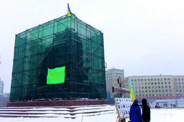 На майдані Свободи постамент, де раніше стояв величезний пам'ятник Леніну, вінчає український прапор. Ілліча проукраїнські активісти повалили торік 28 вересня. Зараз це місце обнесено риштуванням і зеленою сіткою. На ній плакат: "Уважаемые харьковчане! Извините, ведутся строительные работы". Хоча ніхто нічого не будує. Безпеку постаменту охороняють двоє міліціонерів. Перед ним – хрест пам'яті Небесній сотні з портретами вбитих і лампадками.