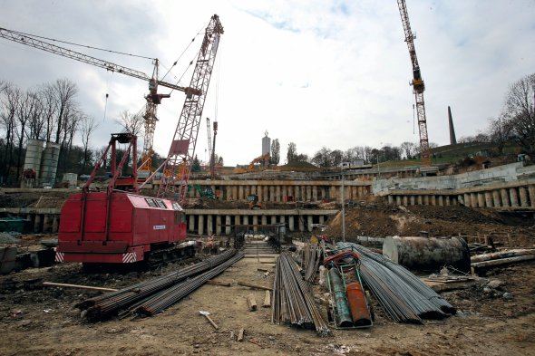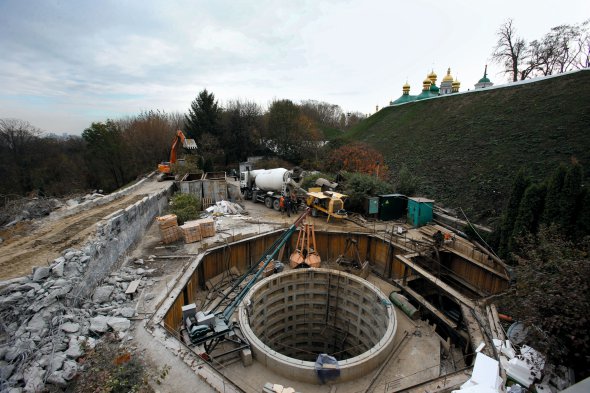 Крутим спуском рушаємо на майданчик музею. Дорога розбита будівельною технікою. Де-не-де стоять калюжі після нічного дощу. Височіють чотири підйомні крани. Екскаватор риє прямокутну яму для встановлення металевих паль підпірної стіни. Неподалік у таку яму троє чоловіків через велику металеву лійку заливають бетон. Їхні гумові чоботи грузнуть у глину.