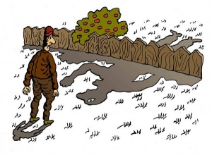 Його вишні та яблуні розростаються гіллям на мій бік, бо у мене нема жодних інших прибудов і сонячно. Сусід поприв'язував стрічки до гілок і, поки вони цвітуть та дозрівають, то на моєму боці. А щойно дозріли - усі стрічки він притягує до стовбура так, аби гілки опинилися на його боці.