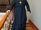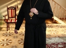 – Слава Ісусу Христу, – вітається. – Ще хвилинку, – заходить в інші двері. Він у чорній рясі з панагією, патріаршою відзнакою, на грудях. Узутий у чорні черевики на шнурівках. Тримає якусь книжку чи зошит. За кілька хвилин спускається до нас широкими дерев'яними сходами з кованими поручнями.
