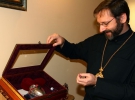 – Це – мощі мученика Йосафата. Їх подарували мені українські священики в Італії, коли я відслужив свою першу літургію в соборі Святої Софії в Римі. Є мощі Івана Боско, Шарбеля. Це шматок коліна Петра Вергуна, – кладе на долоню частину жовтої кістки завбільшки як куряче яйце. – Його проголосили блаженним 10 років тому під час приїзду папи Івана Павла ІІ в Україну. Мощі святих церква використовує, аби благословляти престоли, на яких служать літургії. Їх вшивають в антимінс, що освячує єпископ лише в Страсний четвер. Інакше не можна правити служби Божої.