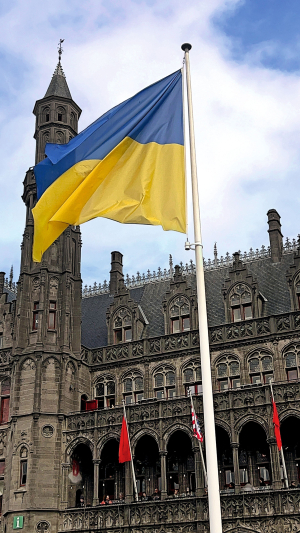 На центральній площі міста біля ратуші XIV ст. майорить великий синьо-жовтий прапор.