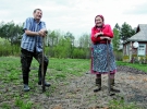 83річна Ольга Атаманчук сапає бур'ян на невеликій ділянці землі, а її 54річний син Леонід скопує. Жінка у "дутиках" і квітчастому фартуху. На правій брудній від землі руці виблискує золотий перстень.