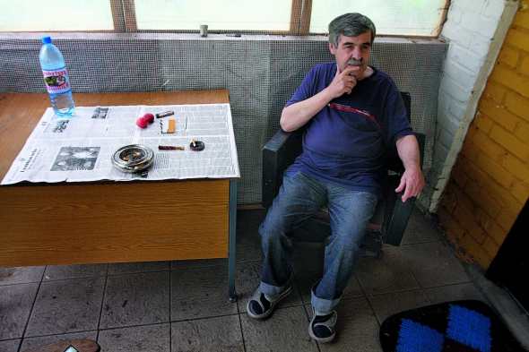 Перед їдальнею на лавці – 81-річний Вадим Шкода із сивими вусами. Письменник і поет, колишній директор видавництва "Золоті ворота". Весь у світлому. На грудях блищить знак пошани, що отримав торік до 80-річчя. Говорить російською, іноді вставляє українські слова – "черга", "спілка", "пляшка".