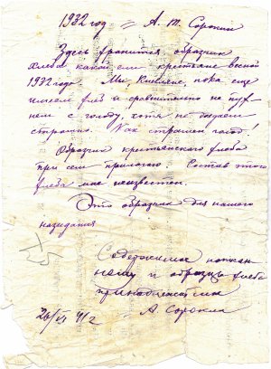 Кримінальна справа Олексія Сорокіна – унікальна. Це єдина виявлена на сьогодні кримінальна справа, в якій речовим доказом були шматки хліба часів Голодомору. Чоловік стверджував, що зберігав їх як пам'ять про пережитий голод, щоб розповісти про це доньці. Шматки хліба були загорнуті у дві записки: "Тут зберігається зразочок хліба, який їли селяни навесні 1932 року. Ми, кияни, поки ще маємо хліб і порівняно не пухнемо з голоду, хоча недоїдаємо страшно. Який страшний голод!