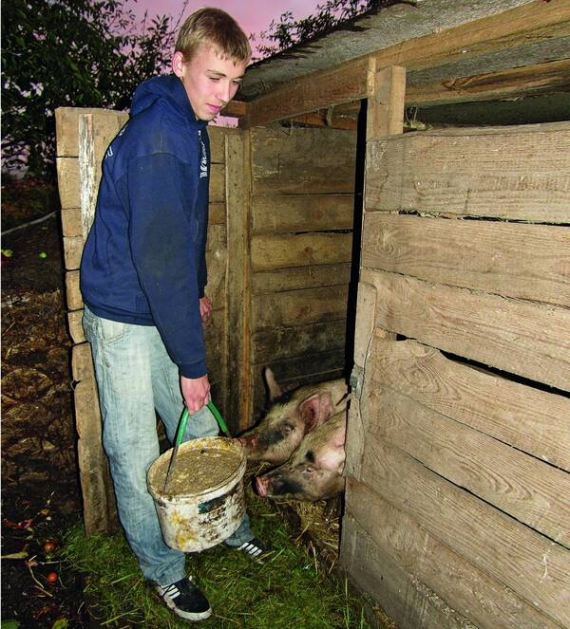 – Влітку було 19 поросят, а на зиму залишили п'ять, – говорить Микола. – Щомісяця одне колемо. Діти м'ясо люблять, і студентам треба щось передати. Поросят хлопці годують. Якось до нас гості зайшли, Артем про свиней їм хотів розказати і каже: "Юлю з Галею цього літа з'їли, Аліна й Анюта беременні ходять". Гості аж заклякли. ­Артем свиней на честь сестер назвав, бо дуже їх любить.