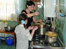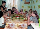 Мати 21­ї дитини Ірина Раранчук із села Фастівець Фастівського району на Київщині перед обідом наливає борщ із 10­літрової каструлі. Донька Зоряна носить і розставляє тарілки на столі
