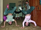 Сергій (ліворуч), Ігор і Ліля стоять на голові. Хлопці навчилися цього на гуртку зі дзюдо. На них із­за дверей дивиться Руслана
