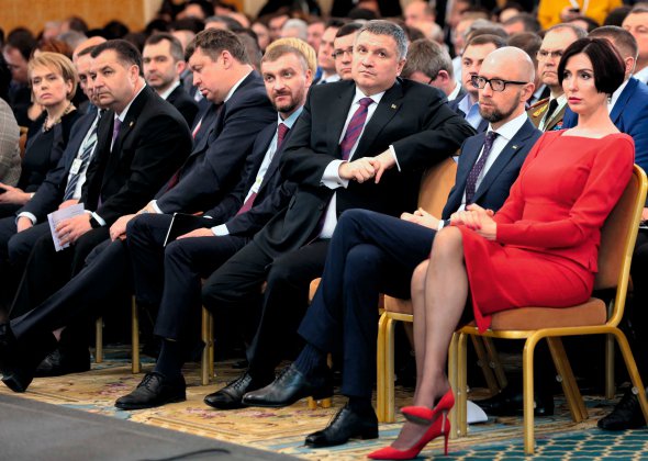 На завершення виступу аплодисменти не стихають майже хвилину. Петро Порошенко виходить у супроводі охорони й журналістки Соні Кошкіної. Вітається за руку з присутніми. Усміхається і дякує. Позаду йде Арсеній Яценюк.