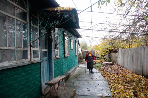 Із Ніною Василівною підходимо до будинку її матері 83-річної Таїсії Коваль. Та сидить на низькому дерев'яному ослоні перед зеленими металевими воротами. Тримає довгу гілку. Одягнена в куртку світло-фіалкового кольору. Розмовляє з кумою доньки, 53-річною Валентиною Білаш.