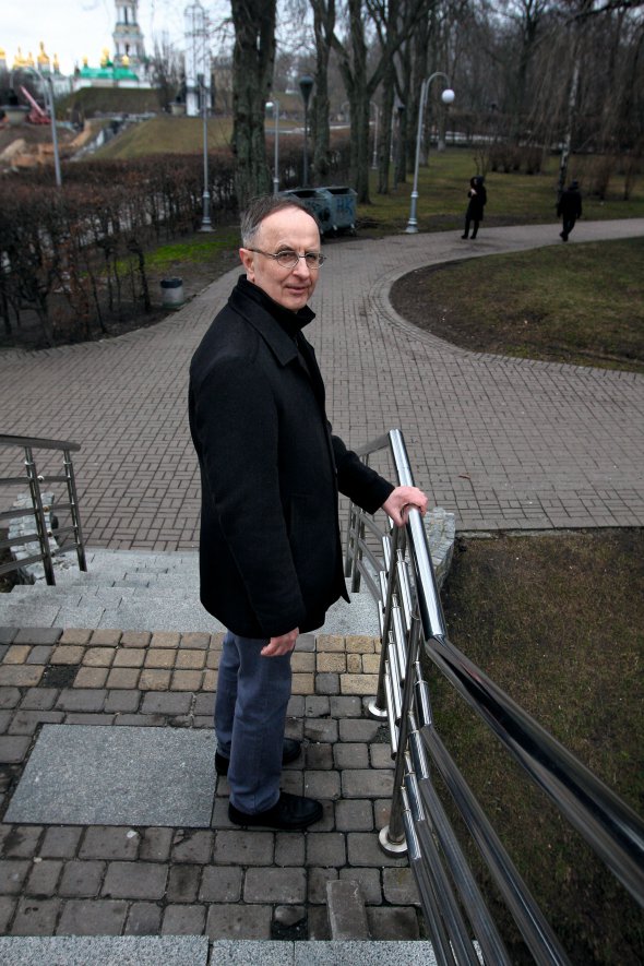 Леонід Григорович пропонує пройтися. Знімає чорну кепку, щоб позувати для фото на тлі будівельних кранів біля другої черги Меморіалу жертв Голодомору.