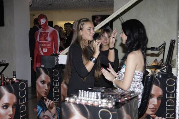 Показ переносять на 23.30. Бармен у білому халаті розливає рожеве шампанське в бокали. 200-грамові стакани наповнює фрешем із кавуна й полуничним мусом. За столик навпроти барної стійки сідає Юлія Айсіна.