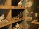 Голуби починають пурхати по вольєру. Один сидить у кутку.